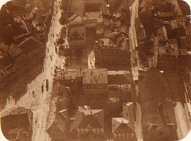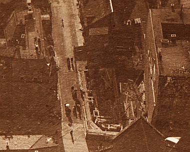 Ein Ausschnitt aus diesem Luftbild zeigt, dass am Keller schon gebaut wird. Man beachte die Menschen auf dem Dach des Hauses links. Diese interessieren sich mit Sicherheit weniger für die Baustelle, als mehr für den Zeppelin, der über ihnen schwebt. Es dürfte sich über einen der ersten Überflüge eines Zeppelins über der Stadt handeln. |