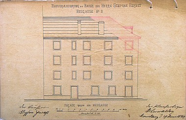 Sauter hat wesentlich mehr Platz - ihm gehört das gesamte Grundstück hinter den ersten Häusern der Neugasse. Wie man an der Zeichnung der Fassade sieht, will er seine Chance nutzen und ein Geschoss höher bauen als das Hotel "Bayerischer Hof" nebenan. Die skizzierte Ergänzung dieser Fassade stammt vermutlich von einem Beamten des Bauamts.