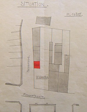 Praktisch ist ein Hof bei diesem Bauvorhaben vollkommen überflüssig und vom städtischen Standpunkt aus keineswegs wünschenswert. Ein solcher würde, weil nach der Straße zu offen, eine störende Lücke in der geschlossenen Straßenfront und einen häßlichen Einblick in hintere Höfe zur Folge haben.