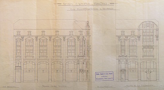 Fassade aus dem Architektenentwurf. Quelle: Stadtarchiv Konstanz, wie auch bei den anderen Planzeichnungen hier.