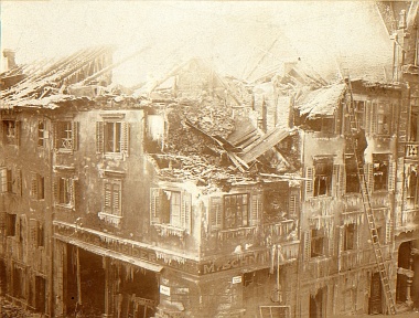 Noch ein Bild dieses Brandes. Interessant auch die vor den Schaufenstern aufgehängten Gaslaternen - nach meiner Information wurde das E-Werk erst ein Jahr später gebaut. |