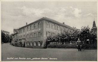 Die oberen Bilder zeigen, dass der Sternenplatz in früherer Zeit bebaut war, und zwar bis in die 1930er Jahre, als dieser Baublock im Zuge der Verbreiterung der Rheinbrücke dem Verkehr geopfert wurde. Hier stand der "Goldene Sternen" der dem Platz wohl seinen Platz gab und der heute in der Bodanstraße zu finden ist. Im Hintergrund links erkennen Sie übrigens das frühere Kasernengebäude (heute Polizeidirektion) und auf dem rechten Bild auch einen Teil des Klostergebäudes, in dem heute das Archäologische Landesmuseum untergebracht ist. Wo damals Bäume standen, befindet sich heute die Bushaltestelle stadteinwärts.